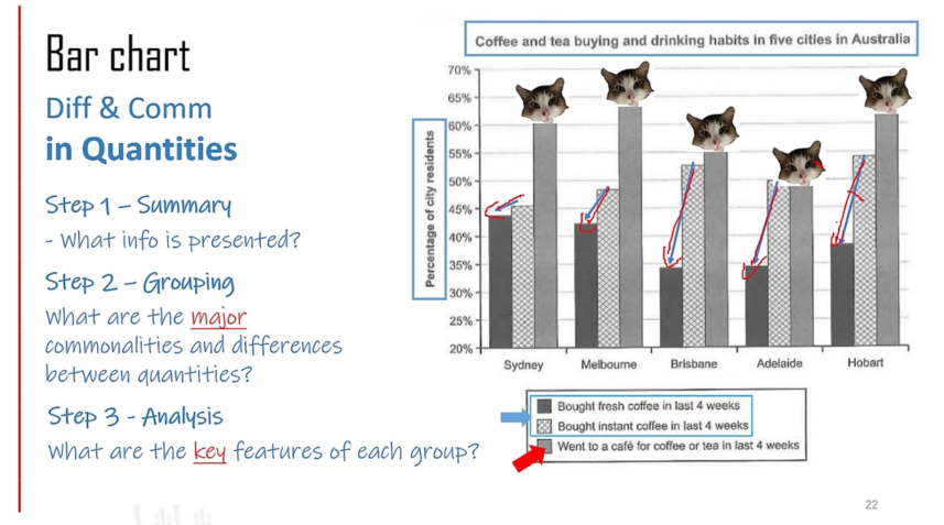 What’s the framework? The bar chart demonstrates the coffee-and-tea buying and drinking preferences of residents in five Australian cities. It shows the proportion of residents who bought fresh or instant coffee, and those that went to a cafe or tea in the last four weeks. -tense -paraphrasing -framework: two axes & data groups