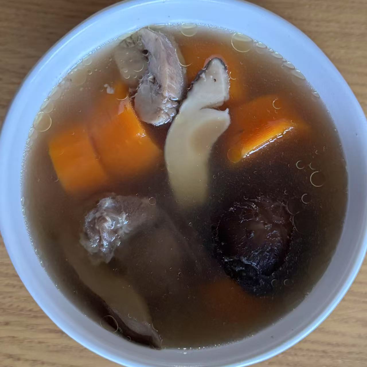 - Simmering the Soup: (1) Transfer the blanched bones or ribs into a soup pot. Add enough water to cover them. (2) Toss in the carrot chunks, sliced shiitake mushrooms, mushroom shreds, and ginger slices. (3) Simmer on low to medium heat (level 3 on a scale of 1–6) for about 3 hours.