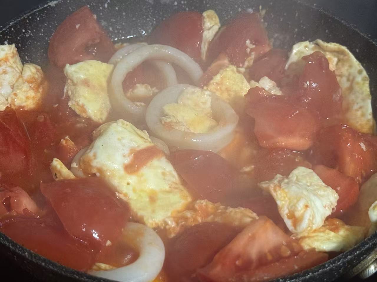 - Add the sliced tomatoes to the pan and cook until soft and juicy.