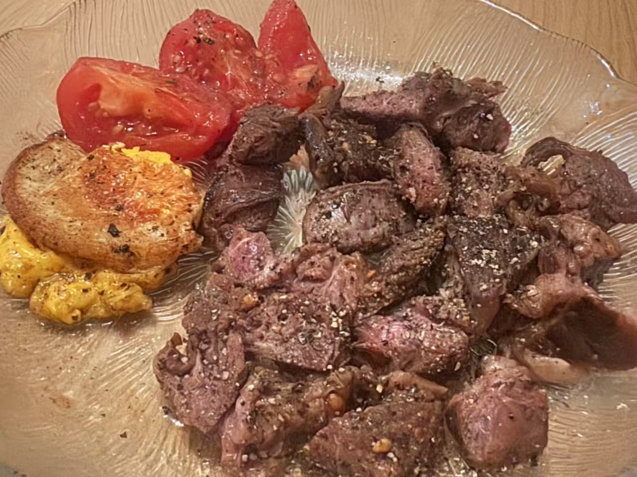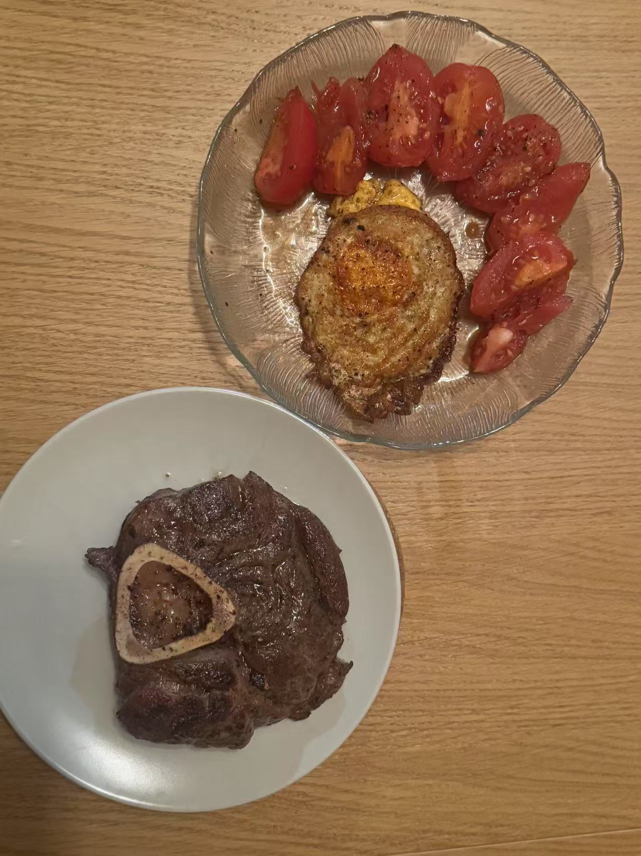 Plate and Serve Place the beef shank slices on a plate, topped with the pan sauce (if you made it). Add the fried eggs and tomatoes on the side.