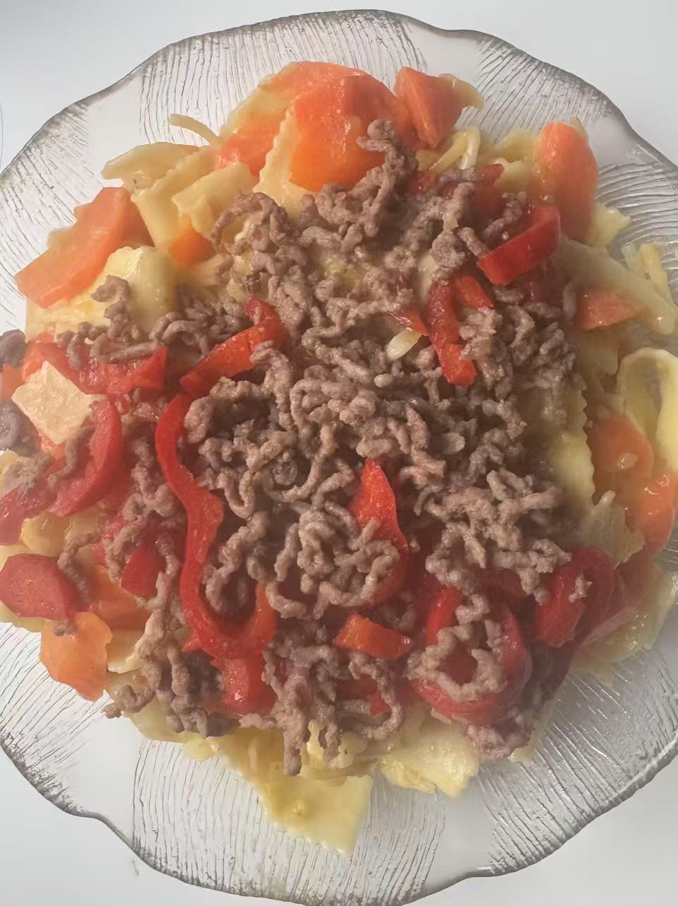 Plate and finish Serve the mixed noodles on a plate and top with the ground beef and bell peppers. Adjust the salt to taste.